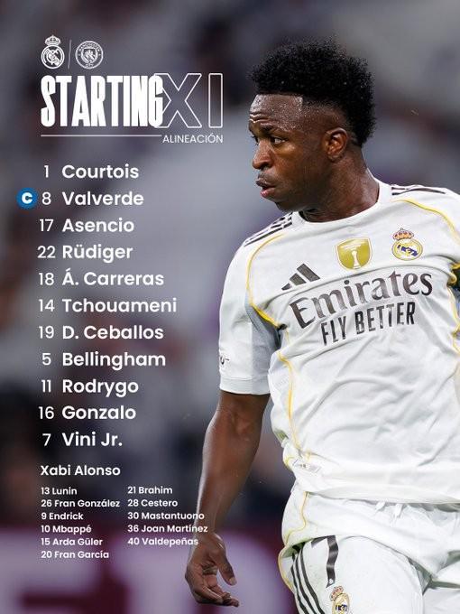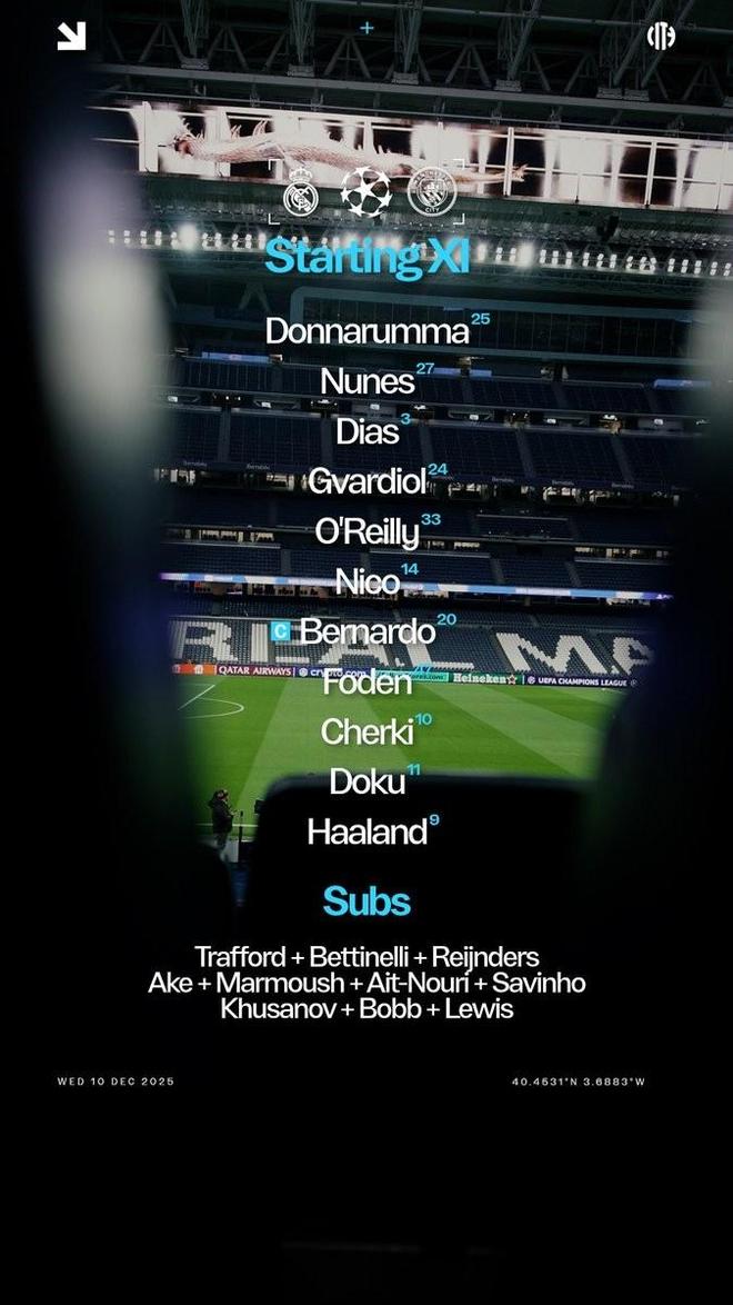 北京时间12月11日04:00,欧冠 联赛阶段 第6轮,皇家马德里主场迎战曼城,赛前双方球队首发名单公布如下: